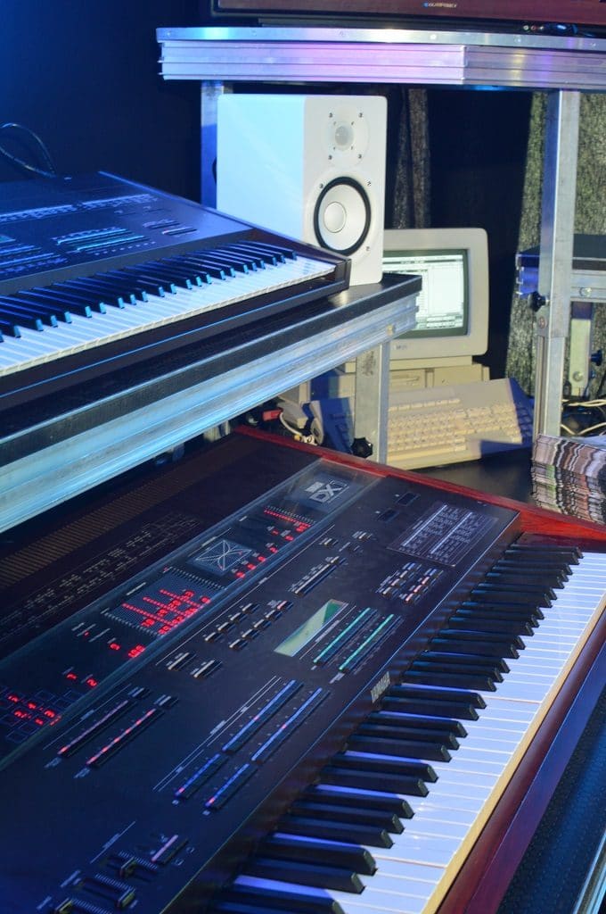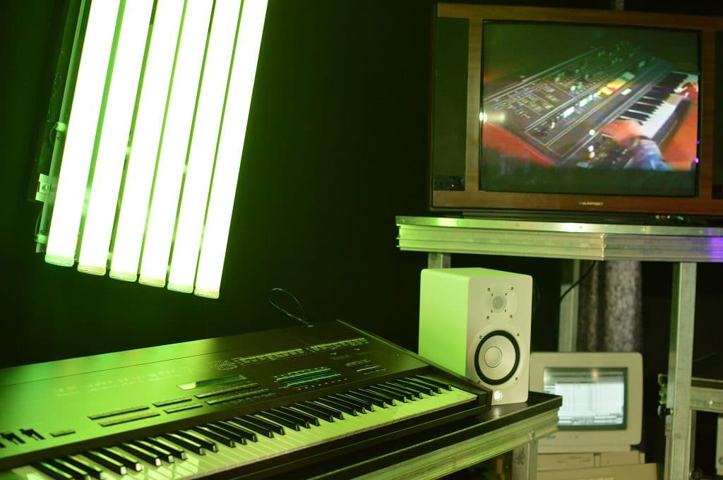 Umgeben von leuchtenden Neonröhren in verschiedensten Farben und Röhrenmonitoren, auf denen alte Werbespots und Produktvorführungen zu sehen sind, fühle ich mich wie auf einer Zeitreise in die 80er. »Museumswärter« Ulf Kaiser öffnet mir das rote Abgrenzungsseil zur Museumsecke und führt mich durch die Historie der Yamaha-Synths. »Natürlich haben wir nicht alles hier. Aber das, was wir retten konnten, haben wir hier aufgestellt«, gesteht Ulf.